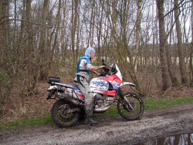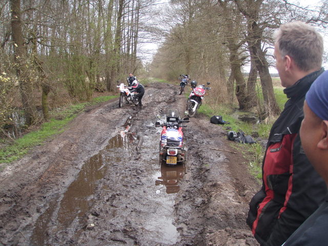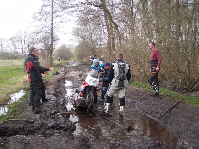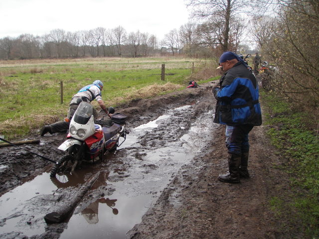 Tim, Annelies en ik waren zaterdag al in Drente een beetje aan het toeren over de onverharde paden. Zondag sloten Olaf en Richard nog even aan. Na een nog geen uurtje rijden zie ik (uiteraard voorop rijdend) in de verte iemand staan. Daarachter stond duidelijk de voorkant van een AT triomfantelijk boven een modderplas uit te stralen. Berijder en collega (ships wat ben ik slecht in namen  :-[ )  waren even een stukje track voor de MS1000 van dit jaar aan het controleren.