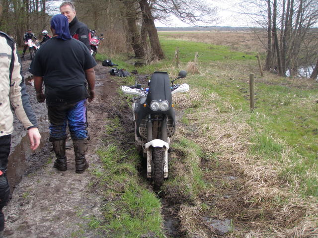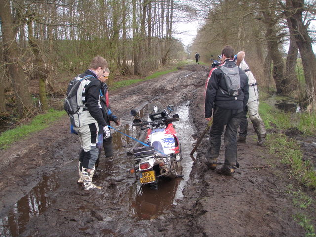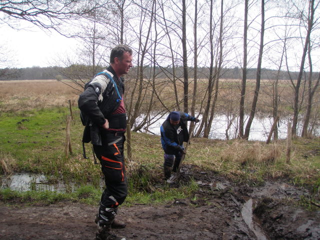 Tip voor offroad uitset: neem een schep en dompelpomp mee. Op deze foto's is er al zo'n 10 cm water weg gestroomd uit de kuil via de door Frans en mij aangelegde Drentsche Waterwerken. Of heb een groot hart en ga volgas door een dergelijke kuil.