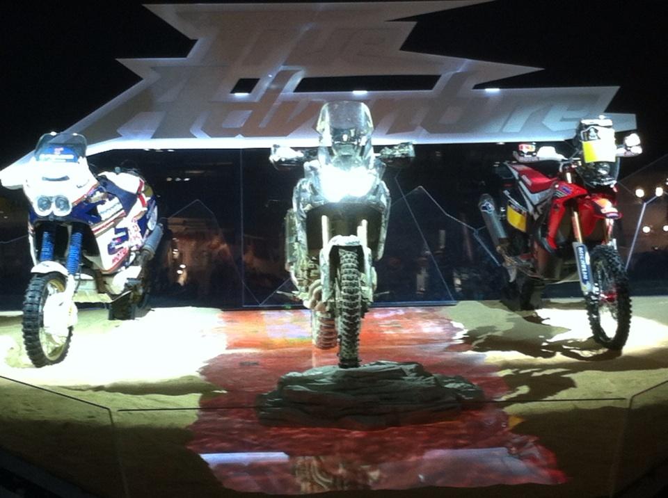 The second prototype on display is the True Adventure Prototype. Inspired by both Honda’s fantastic heritage in adventure motorcycling and our recent Dakar programme, the True Adventure Prototype captures the product direction as Honda seeks to expand its presence in the Adventure segment. This prototype has been developed to deliver outstanding off-road capability, and could provide the basis of a true round-the-world motorcycle. It’s flanked by the current Team HRC CRF450 Rally and, paying respect to Honda’s competition legacy, the 1989 Paris-Dakar winning NXR Africa Twin ridden by Gilles Lalay.