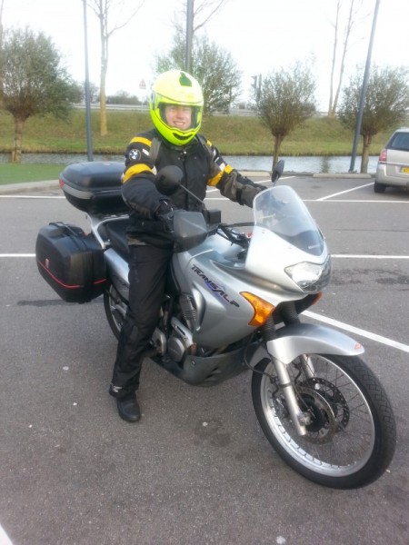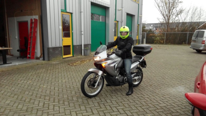 na uiteraard de nodige proefrit een week eerder. Op de foto te zien ben ik er enorm blij mee. Het is een Transalp 650 XL uit 2003. Heeft al wel de nodige KMers gemaakt. Er staat nu ~74500 op de teller. Een transalp moet daar geen probleem mee hebben en kan natuurlijk veel meer knallen.