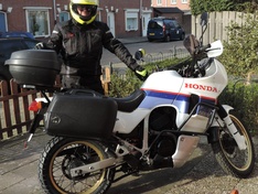 De motor is helemaal af en zal volgende week vrijdag opgehaald worden. Het was een standaard Transalp PD06 uit 1990 met alleen een middenbok, maar hij miste de duosteuntjes. Die zitten er nu op, er is een nieuwe achterplaat op gekomen (met bijpassende topkoffer), een Hepco & Becker kofferset en een paar Givi valbeugels. De banden zijn vervangen door een nieuwe set Dunlop on/offroad.