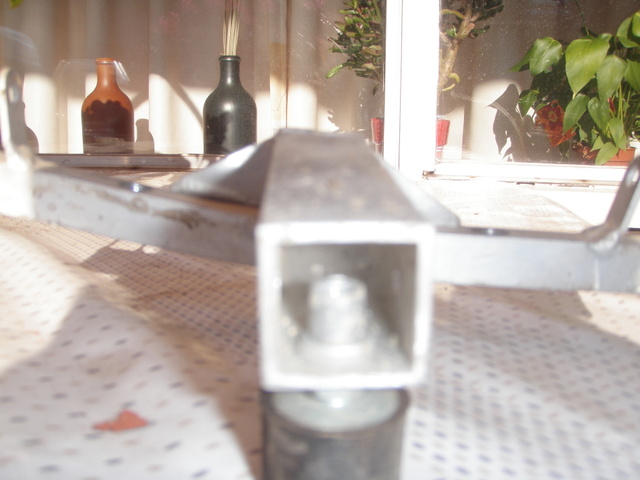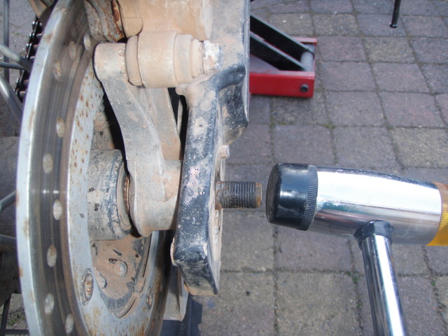 Vervolgens het geheel op de krik gezet en de as eruit al iets naar buiten geslagen