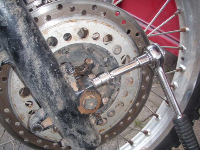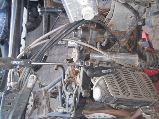 Wiel eruit, en nu de bouten waar de vorkpoten mee vast zitten losmaken :