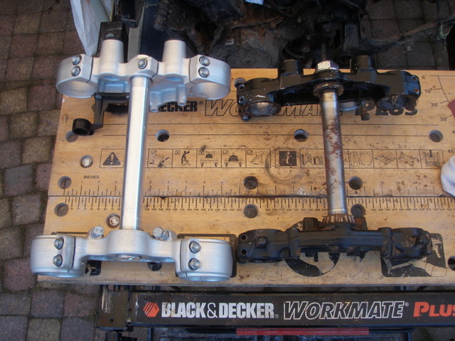Ook beiden nog even op de weegschaal gezet :  De kroonplaten van de twin wegen 2,8 kg. Die van de KTM 1,9. Dus alleen al in de kroonplaten een gewichtsbesparing van 900 gr......