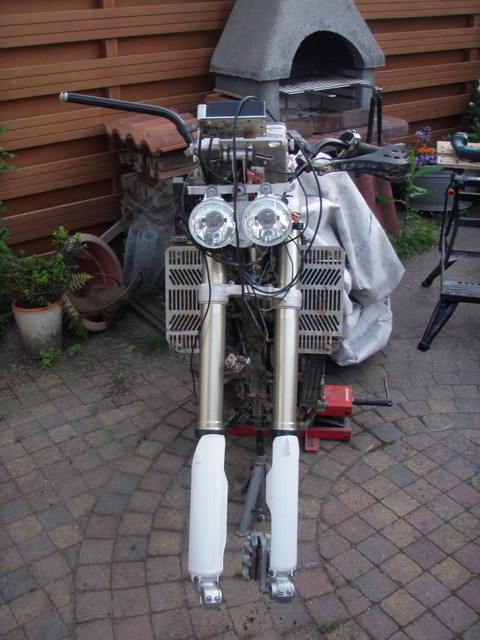 Jaja.... het kost wat tijd, maar dan heb je ook wat. Al met al dus wel weer een fix aantal uren werk. Je merkt toch dat her en der wel even iets onverwachts de hoek om komt kijken. Maar zo'n zaterdag vanaf 10:00 tot 15:00 uur vrijwel aan 1 stuk door kunnen klussen is wel heel handig. Remmen en kabels monteren en van olie voorzien. (Ik snap werkelijk niet dat mensen hier zoveel problemen mee kunnen hebben, dat was echt een eitje). Olie en filters vervangen. Monteren van de nodige spulletjes. Verlichting controleren..... (zo'n tegenslagje als een knipperlichtje het dan wel en dan niet doet.....  jaja, dat hoor een knipperlicht te doen, maar in mijn geval was ie toch niet meer helemaal lekker..... maar weer eens geleerd om in zo'n geval na een half uur klooien en pielen maar beter een schaar erin te zetten en het spul te vervangen, kost minder werk.)