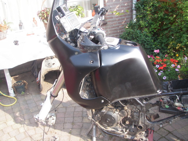 Om de voorkant te passen (omdat de ophanging scheef was) nu even de tank en kuip gemonteerd.