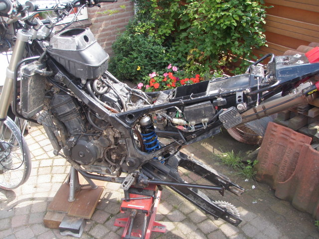Spiegel nog bestellen, en dan kan ik nu direct vrij weinig. Denk dat ik na het weekend de achterbrug en de vering vanuit de andere twin over ga zetten zodat ie in ieder geval op z'n achterpoten kan staan. Daarna is het gewoon belangrijk dat ik de remleiding heb en kan ie voor ook op z'n pootjes.