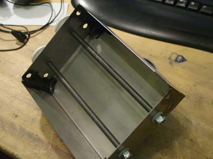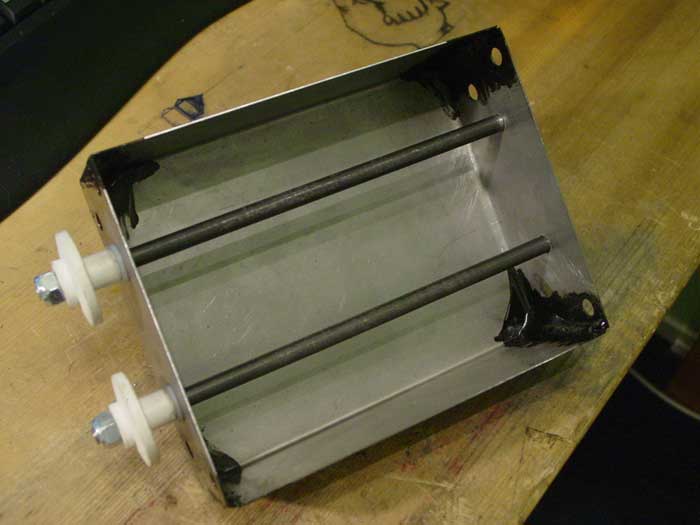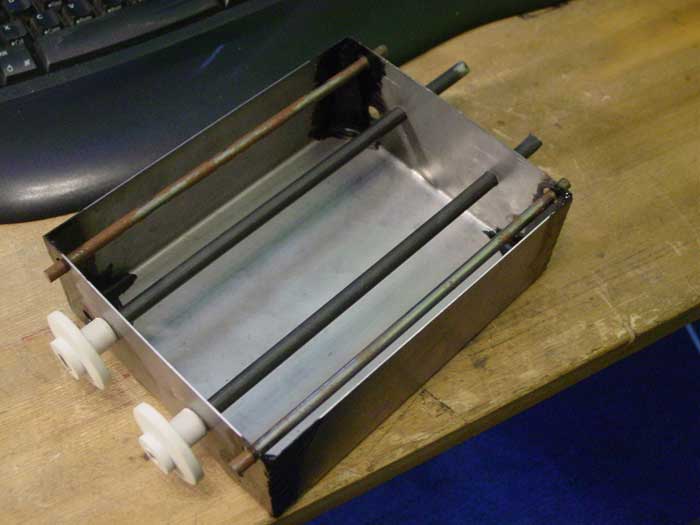 Mooi gemaakt! Ik rij zelf al sinds 1997 met de 'Halfords' versie, maar in een 'plastic' doos gezet (dezelfde kunststof die gebruikt wordt voor b.v. modelbouw). De twee assen extra verbonden door een rubberen ringetje (stukje fietsbinnenband). Er passen max. 12 A4 formaat in.