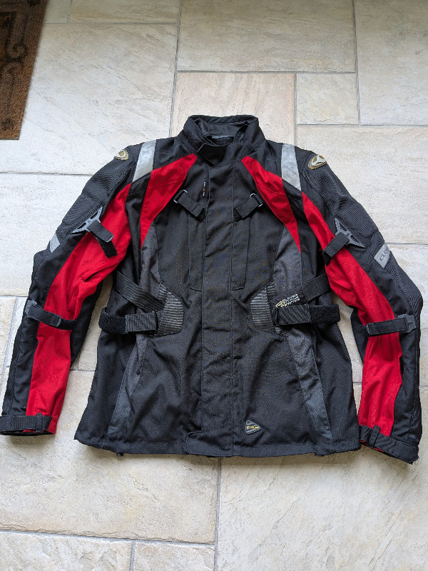 Aangeboden in goede staat verkerende all-season motorjas van het Italiaanse kwaliteitsmerk Clover, voorzien van ademend membraan, maat 54, valt als motorjas XL. Wintervoering ontbreekt helaas maar is geen ramp een losse fleece trui of vest neemt die functie over en vind ik zelf ook prettiger dragen en is ook na het motorrijden te gebruiken. Voorzijde is voorzien van een labyrint sluiting met klittenband en een rits dus winddicht.